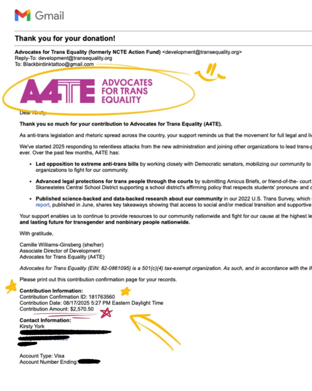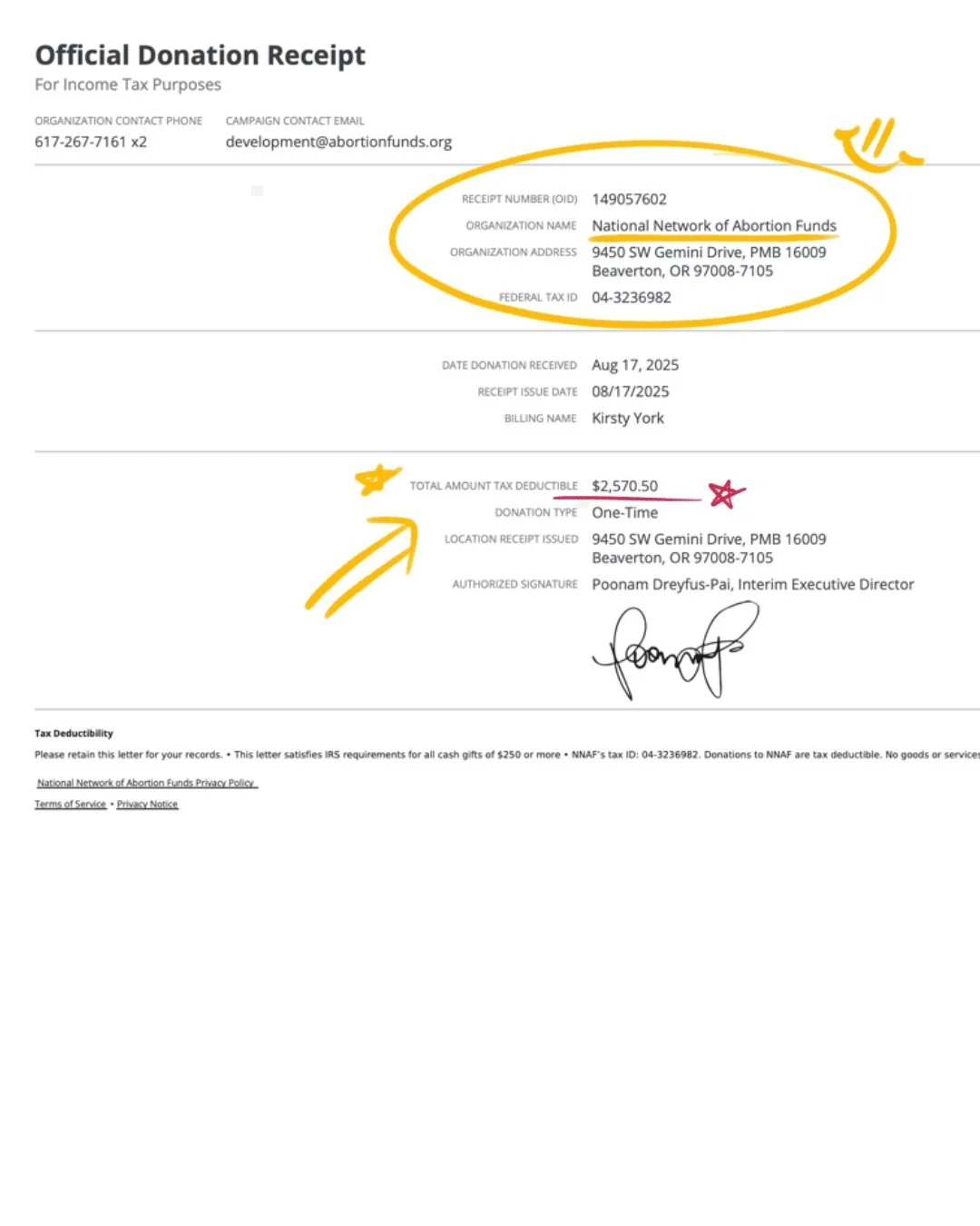 100% OF YOUR MONEY WAS DONATED BETWEEN TWO ORGANIZATIONS, THE NATIONAL NETWORK OF ABORTION FUNDS THE NATIONAL CENTER OF TRANS EQUALITY DONATION RECEIPTS BELOW!