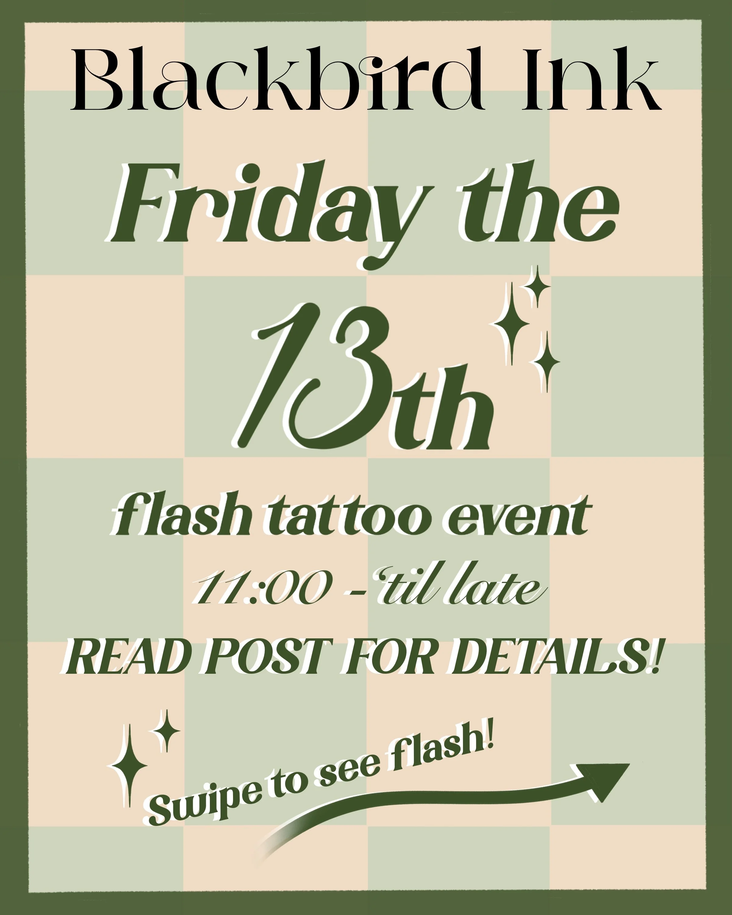 We will be doing first come first serve for flash tattoos. You are welcome to line up before the event starts at 11:00, the earlier you line up the better chance you have to get tattooed. At 11:00 we will start letting people in to sign up! There will be a sign up sheet, come sign up and we will call you when you are next. If we do not get to everyone on the list, we will call you and book you for a different day. So still worth it to wait in line even if we don't get to tattoo you on the 13th!