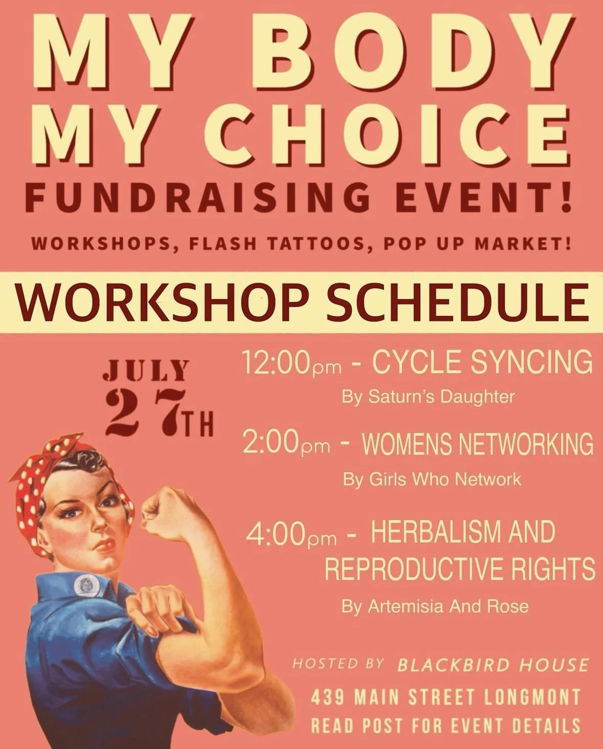 This year we will also be doing a pop up market in our retail shop downstairs, Blackbird House, with a panel schedule full of talks and classes on reproductive rights related issues! See panel schedule below.